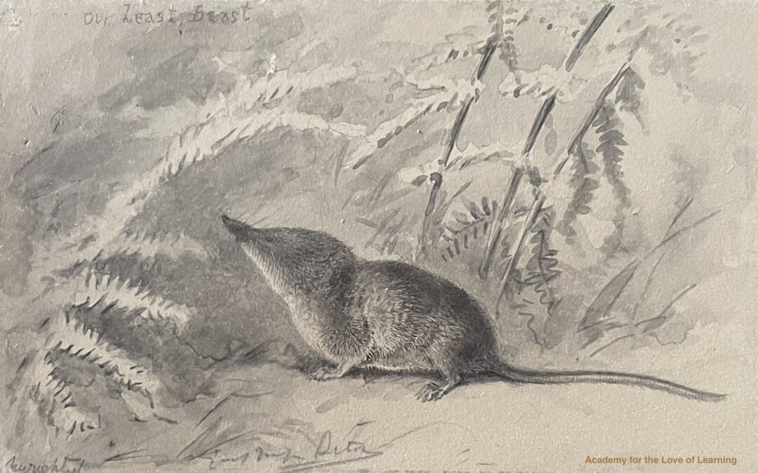 ALL #0619 Drawing: Ink Wash, Pen & Ink on paper. Post dated as 1900. 8.3 x 13.1 cm., glued to backing board. Published in By A Thousand Fires (Julie Seton, 1967). Unspecified shrew species.